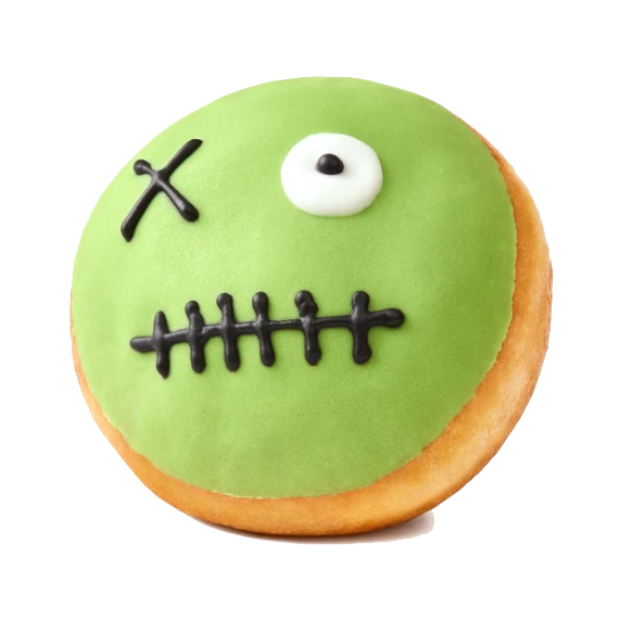 Пончик с банановым кремом в сахарной глазури с воздушным рисом и стеклянной карамелью.