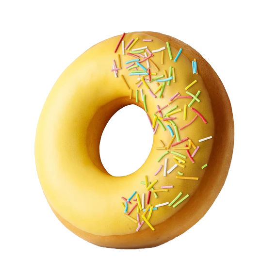 Пончик с банановым кремом в сахарной глазури с воздушным рисом и стеклянной карамелью.